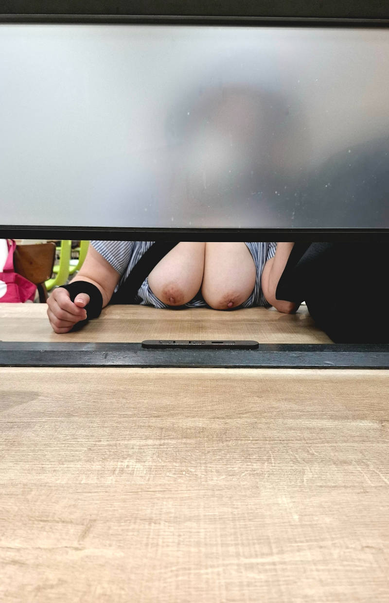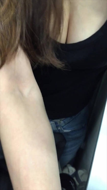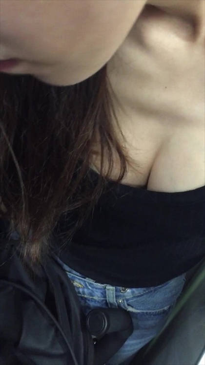 電車内で胸チラしている巨乳妻。