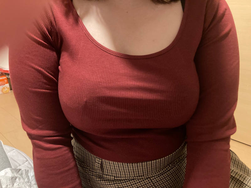 自慢の胸を自撮りしている巨乳妻。