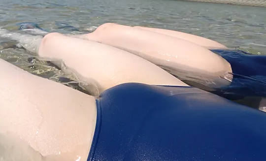 お尻に食い込んだスクール水着に指を入れて直している女子。