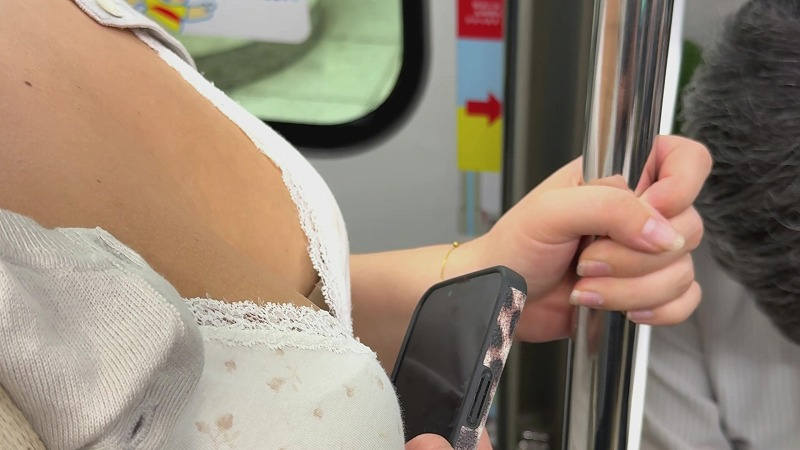 真横から胸の膨らみを観察する着衣巨乳画像。