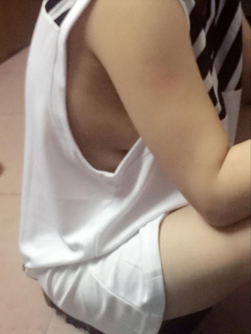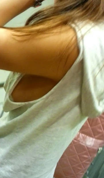 服の隙間から乳房と一緒に乳首まで見えてしまっている貧乳女子の横乳。