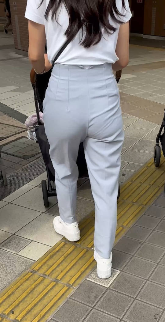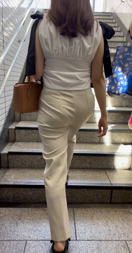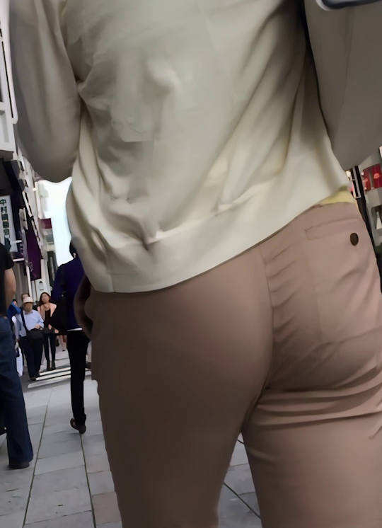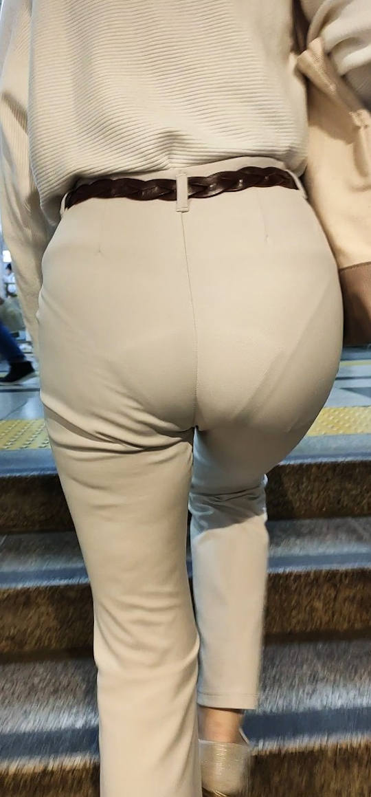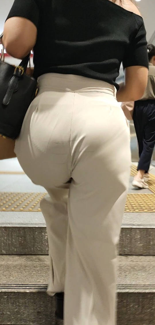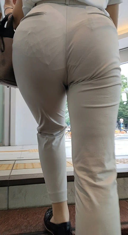 お尻の形が丸分かりなハイウエストパンツ女子。