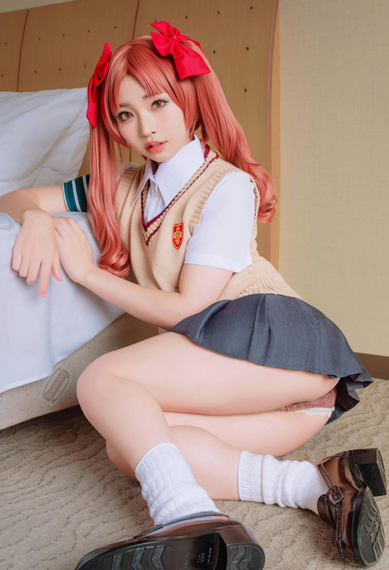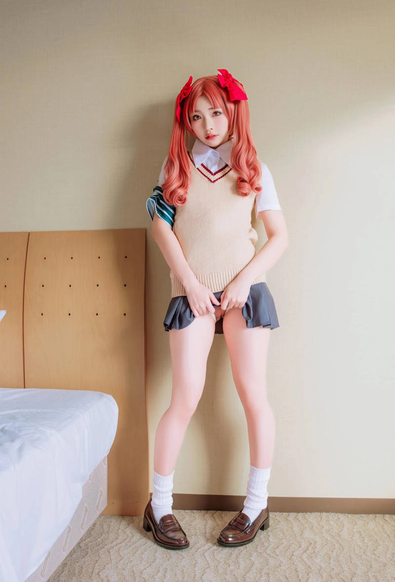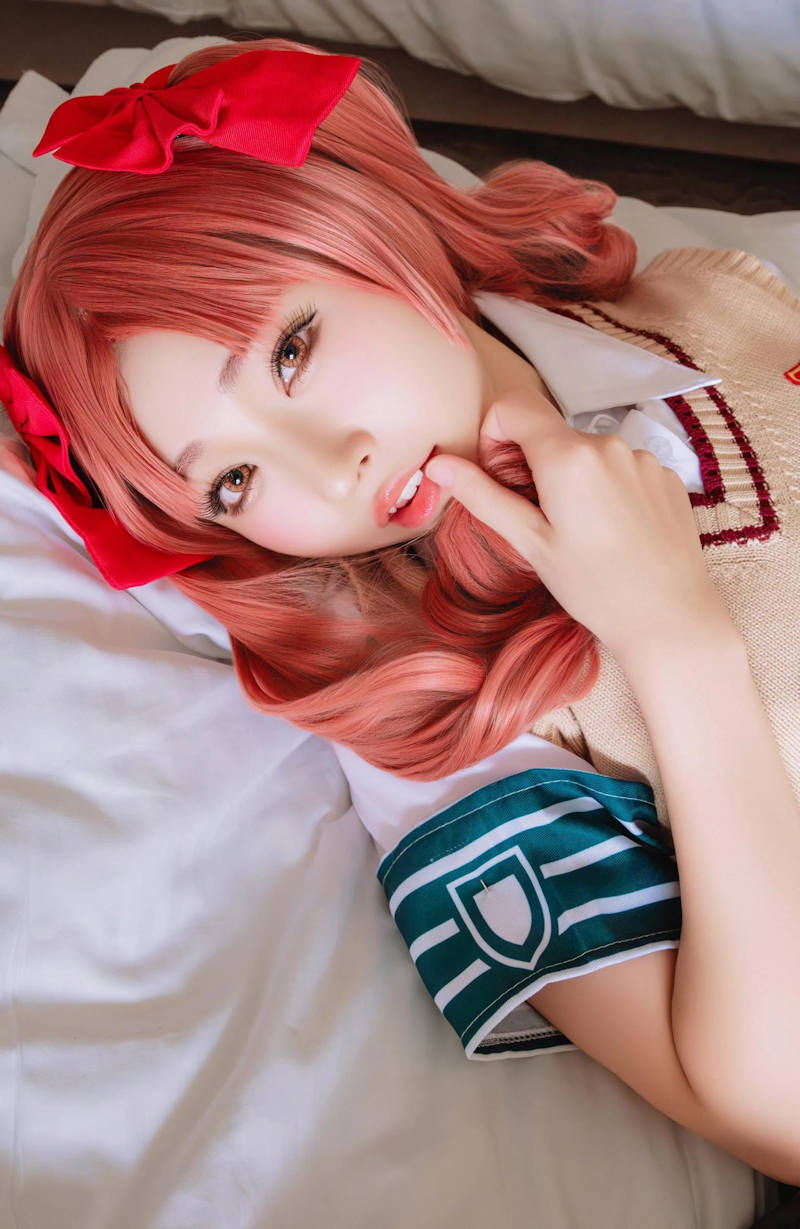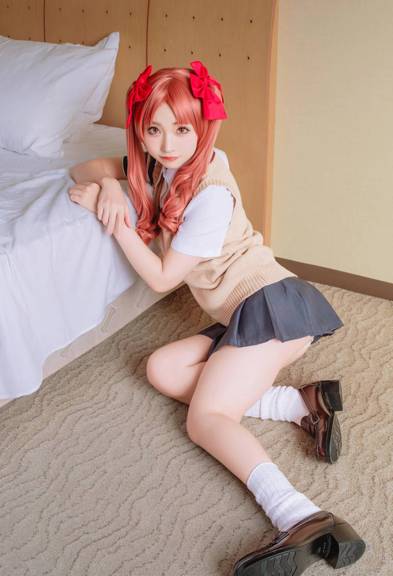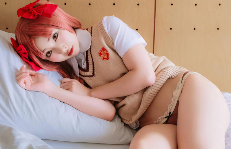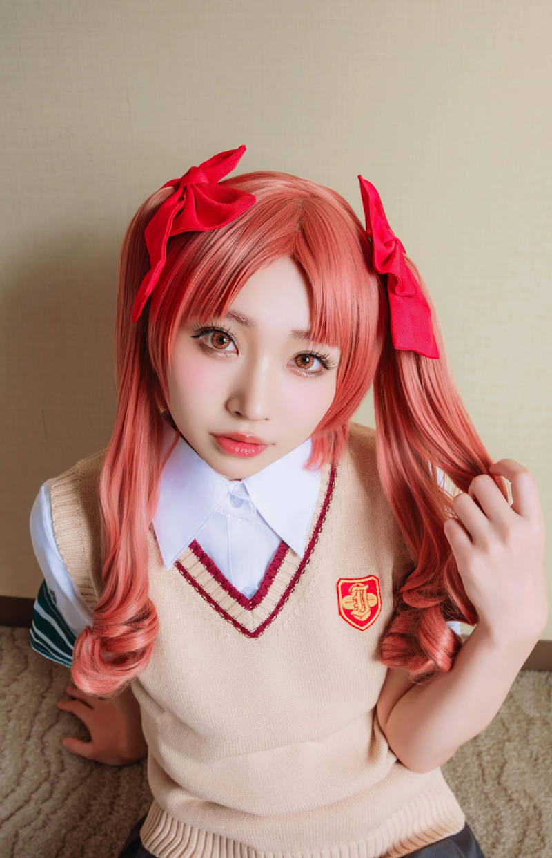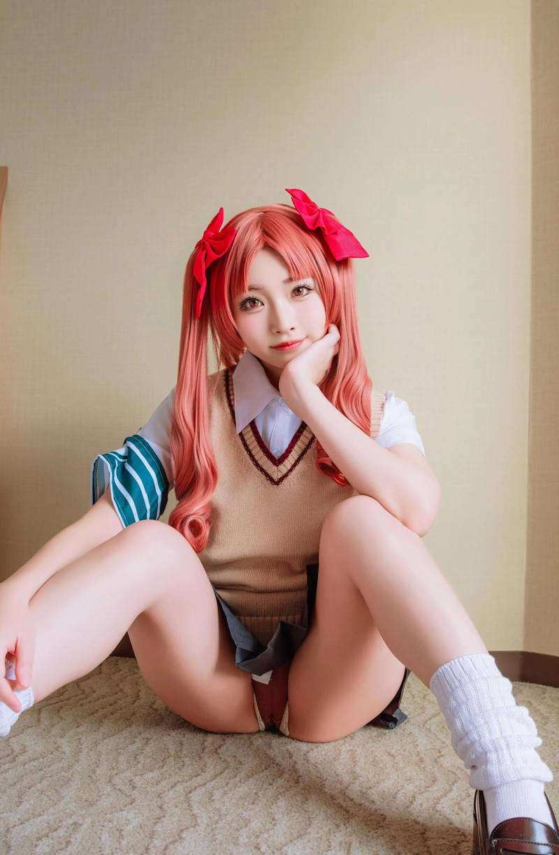 おっぱいが小さくて可愛らしい顔をしている、ピンク髪貧乳JKのコスプレエロ画像。