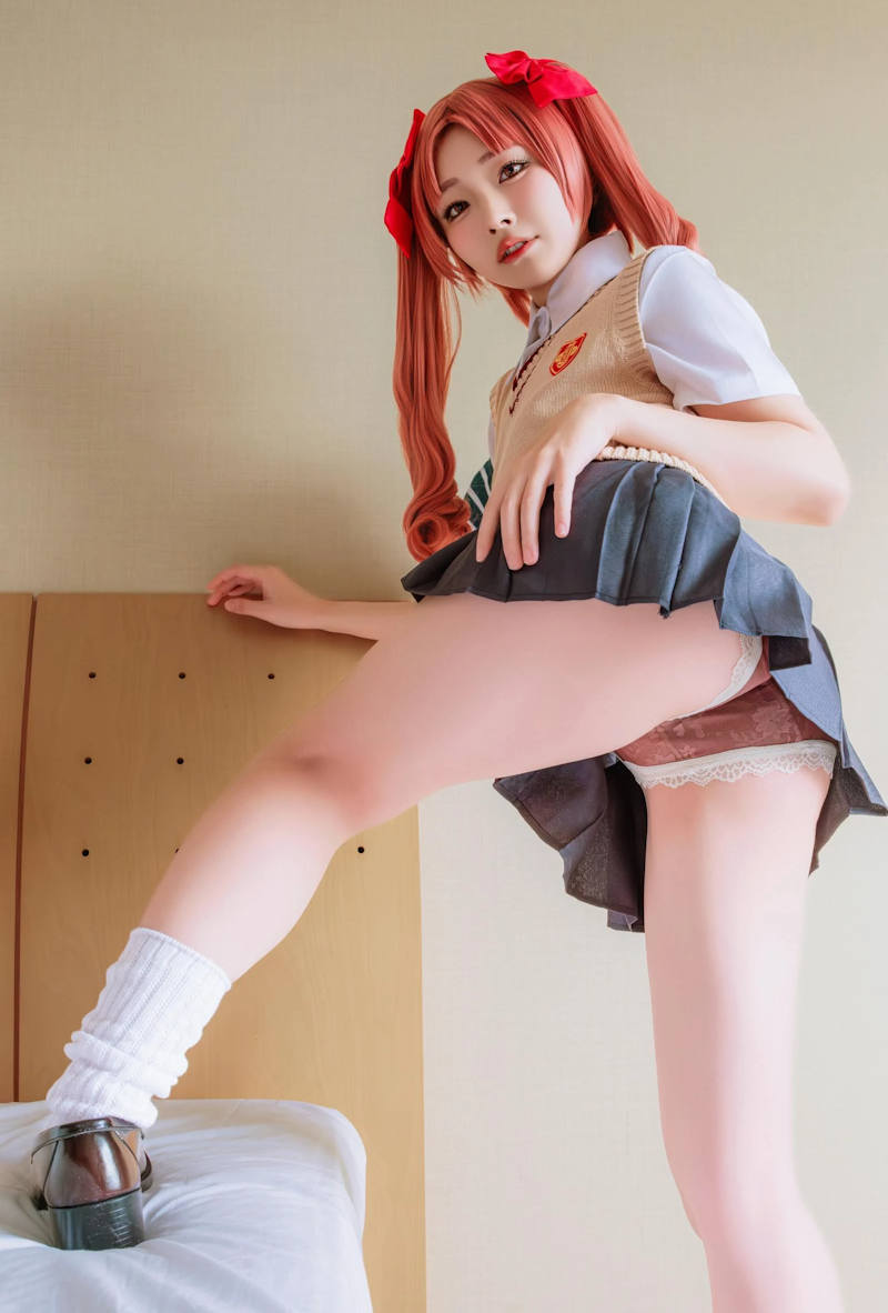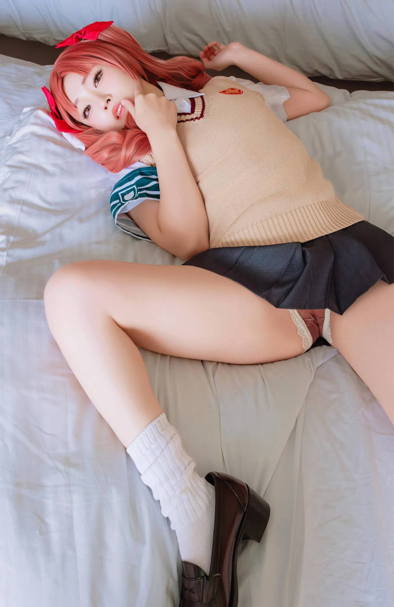 ピンク色のウィッグを装着したコスプレJK女子のエロ画像。