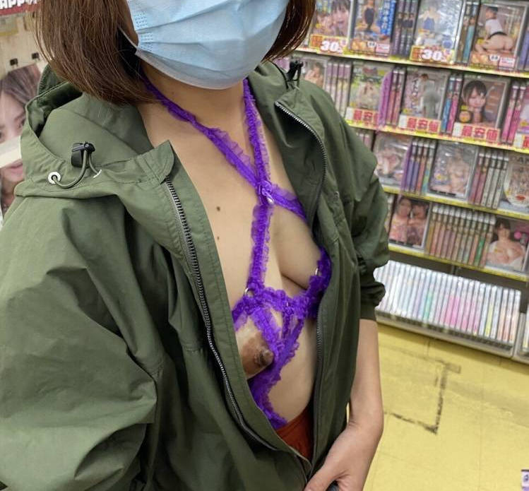 自慢の下着で露出行為を行う、セクシーランジェリーの店内露出・野外露出エロ画像。