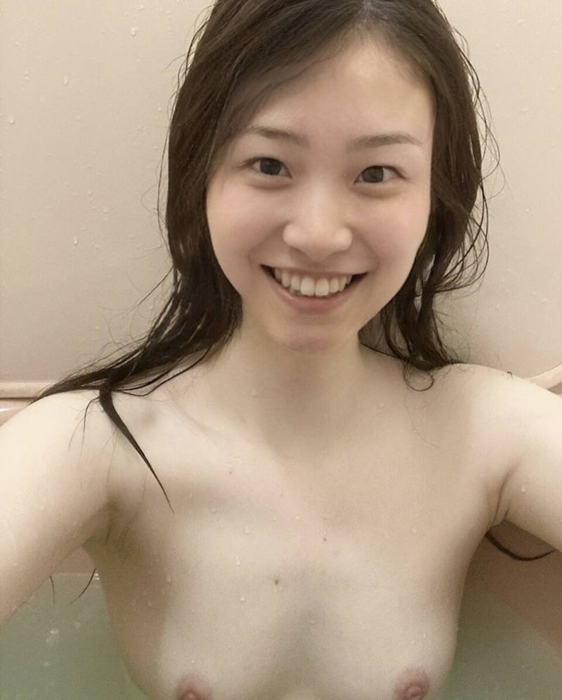 全裸になった女性が露わになった上半身を撮影している、おっぱいヌードのエロ画像。